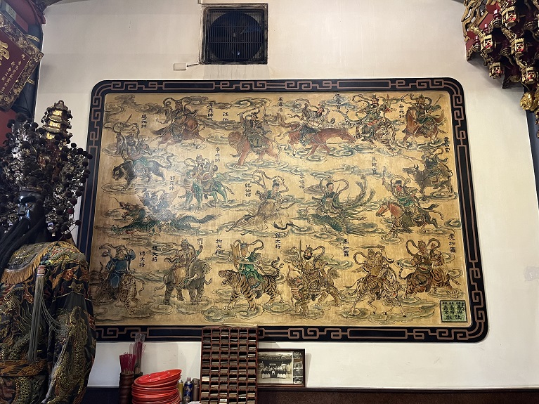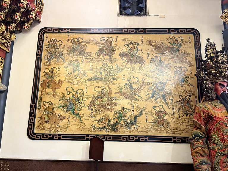 而在藝術層面,靈祐宮更令人駐足流連。正殿內的「三十六官將」壁畫出自蔡草如之手,畫中神將栩栩如生,彷彿隨時會自壁中跨步而出。虎邊壁面尚繪有一尊麒麟,造型獨特,尤為吸睛。其筆觸在豪放之中蘊藏細膩,每一道線條皆承載著深厚的信仰力量與藝術修為。此外,過水廊兩側壁畫為潘岳雄所繪,拜殿與正殿之間的彩繪則出自陳壽彝之手。雕樑畫棟間,處處可見臺南匠人文化的深厚底蘊與藝術傳承。