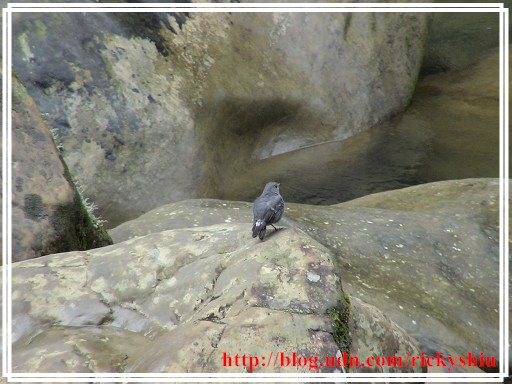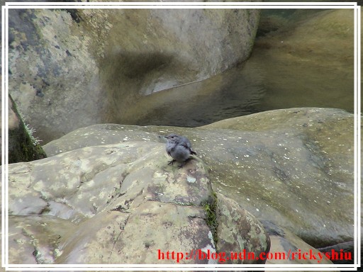 休息片刻,待體力回復後,隨即依原路下山。當走至先民隧道前的枕木步道時,突然瞧見一隻鉛色水鶇於溪澗巨石上,專注盯著水中游動的小魚,蓄勢待發準備隨時享用大自然的「刺身」大餐。