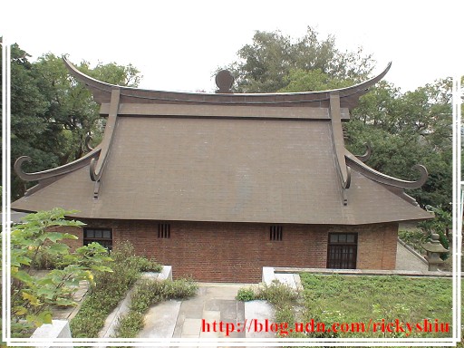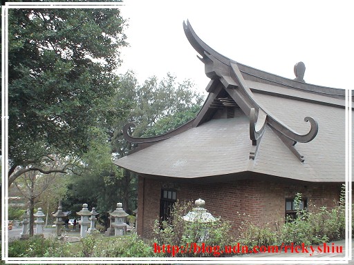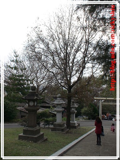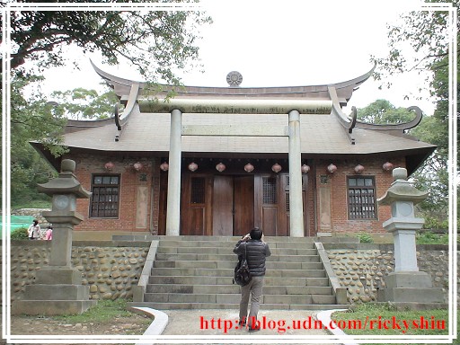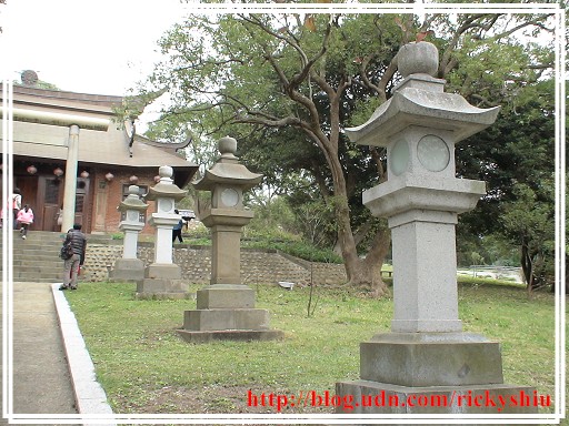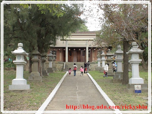 由鳥居下的參拜道望去,左右兩側的石燈籠有些是新建。但看起來最突兀的,莫過於被改建為忠烈祠的屋頂那個大大的圓型國民黨黨徽,充份反映出以往那「黨國一體」的「政治正確」。既然是奉祀對國家有功「烈士」的忠烈祠,照理說屋頂應該放的是中華民國國徽才是吧!