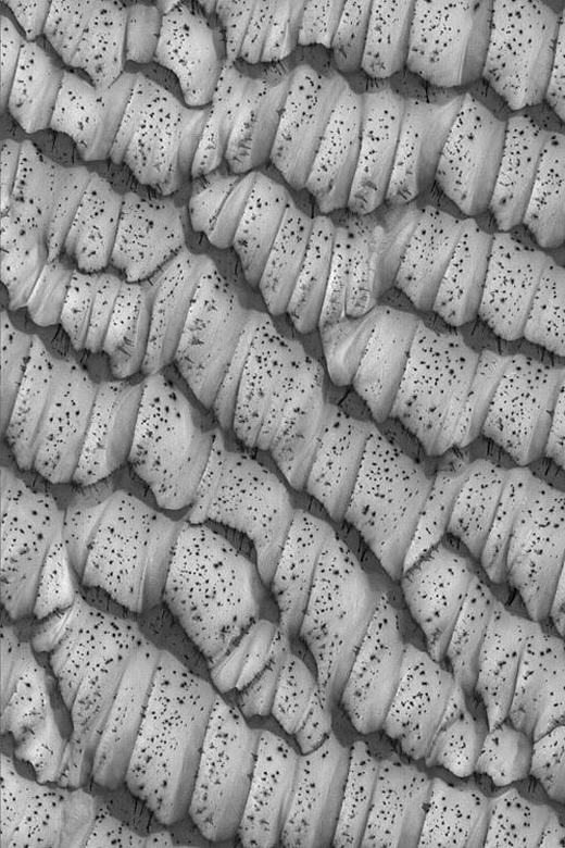 照片中看起來像是麵包的東西是火星北極的沙丘。科學家相信,這些沙丘是沙子、水冰和乾冰混合而成的結凍層。