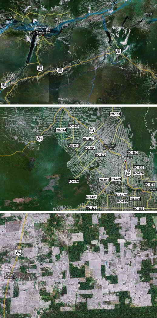 第一張大尺度照片顯示,沿著河流和公路,砍伐森林的斤斧漸漸深入內地,成為網狀。