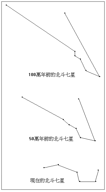 所以,中國人說斗換星移,真是有智慧的說法。最下圖顯示的,是 100 萬年前的北斗七星、50 萬年前的北斗七星,以及現在的北斗七星。可以預知的,再過若干萬年,現在的北斗就會變型,以致再也認不出了。
