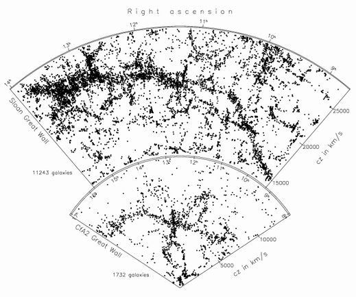 圖中上方那個較大的扇面,是 2003 年才完成的,是距離我們較遠的星系團。從圖中可以看出來。星系並不是平均分布的,而是集中在像是肥皂泡的表面,泡泡與泡泡之間,就擠出一道道星系的長城來。