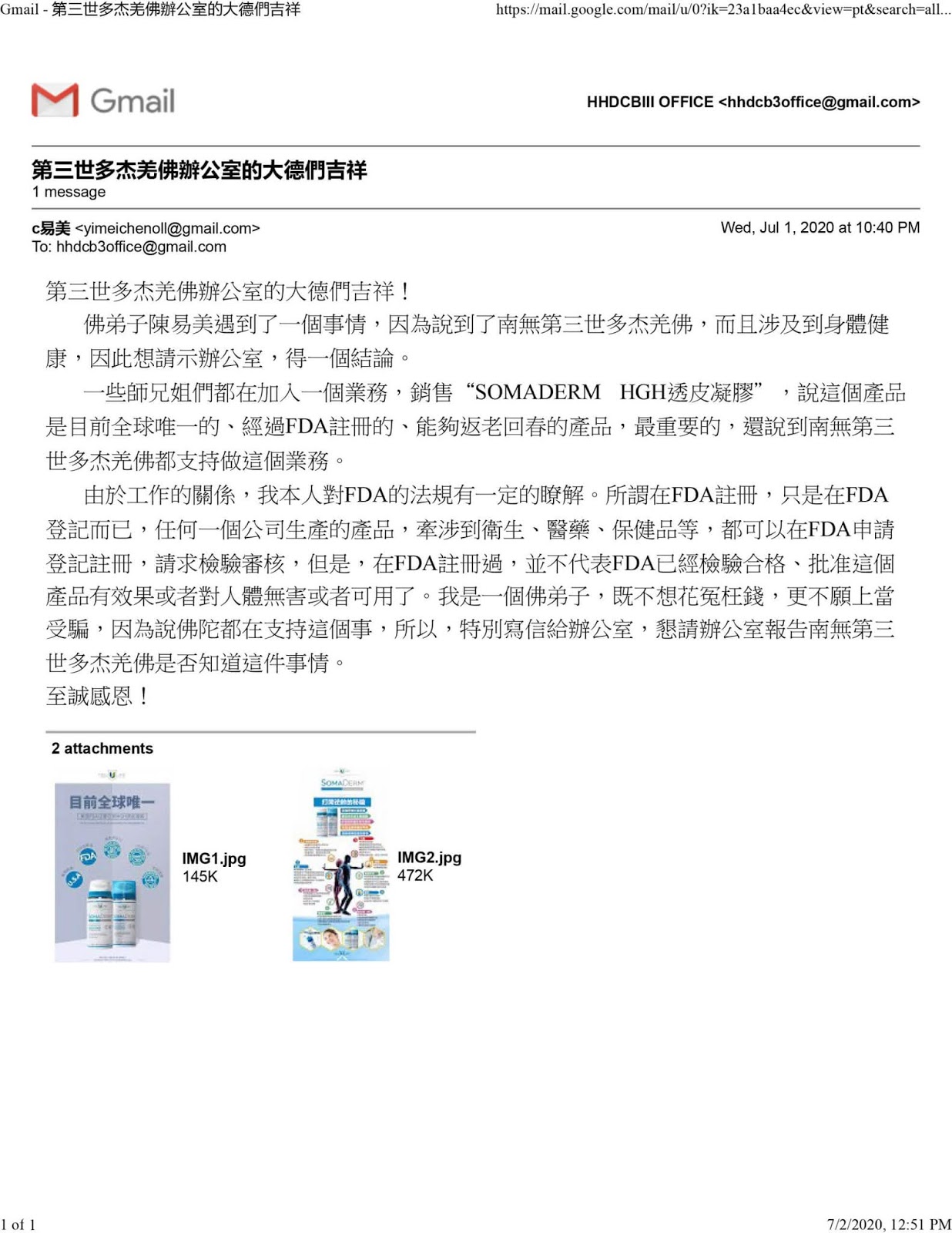 第一, 南無第三世多杰羌佛及佛陀家人昨天晚上(7月1日)看到來信諮詢後,才第一次知道這個“SOMADERM HGH 透皮凝膠”產品的名稱,也才知道社會上有人打著佛陀的牌子搞買賣,但至今也沒有過問是哪個公司或哪些人在做這些業務。