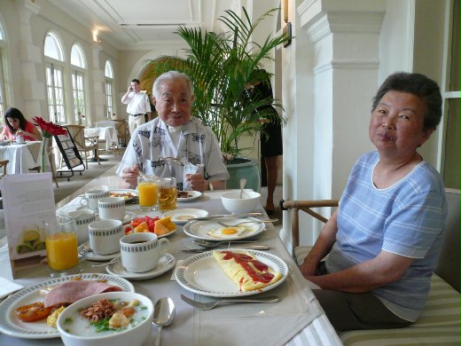 (上圖:公公、阿嬤在新加坡Good Wood Park Hotel悠閒地享用早餐。)