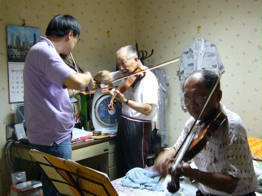 (下圖一:為了妹妹歸寧,公公、爸爸跟我練小提琴。公公自己改編「甜蜜的家庭」與「金婚式」成二重奏與四重奏,要在歸寧宴上祝福妹妹。)
