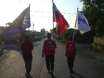這次格外吸引我的,不是表情豐富的馬英九,也不是在輪椅上激動的老奶奶,而是走在隊伍最前面的這三位老爺爺。他們分別挺著國旗、黨旗與代表眷村的旗幟,頭也不回地走在馬英九前面。