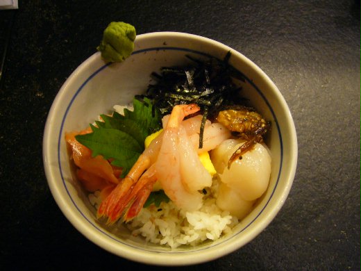 「甜蝦干貝丼」(下圖一)是比較昂貴的選擇,然而一碗不過一百五十元,還是很經濟。甜蝦四、五尾,干貝兩三塊,對於愛死甜蝦的凌哥來說,真是致命的吸引力。