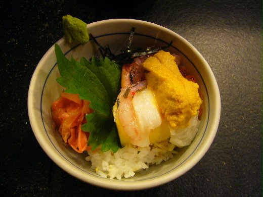 魚僮小鋪最奢華的蓋飯是「海膽什錦丼」(上圖),一分兩百元,在台灣這種「海膽沙漠」國度裡,凌哥覺得滿難得。主角海膽,鋪在新鮮帶絲的山藥上,一旁忠誠陪伴的是鮭魚卵;其他還有甜蝦、白魚蝦卵、玉子燒、干貝等,再配上紫蘇、海苔、醃漬生薑等,口感華麗得不得了!