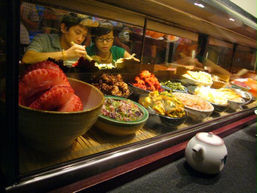 其他各色小菜(下圖一)包括山葵章魚、櫻白魚、海味螺片、花枝條、核桃丁香、山海貝柱、飛魚子、章魚醋、醋竹莢、生菜沙拉等,雖然不是別處吃不到,但價格公道,一律五十元;總匯沙拉、鮭魚卵沙拉均一百元;鱈魚肝貴些,要價一百五十元,但吃來仍相當過癮。