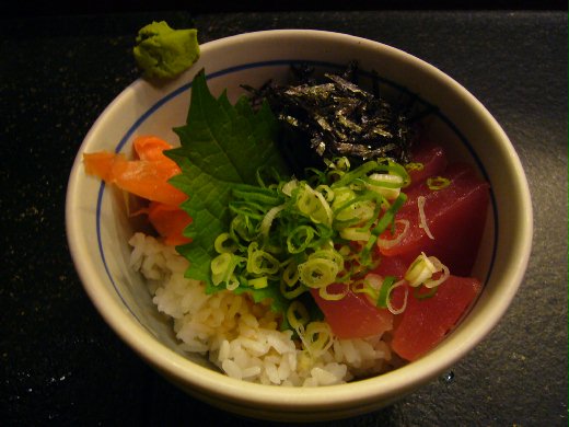 「蔥花鮪魚丼」(下圖二)價格也實惠,只要一百元,但口感特殊;說也奇怪,魚僮小鋪的蔥花特別香,大口搭配厚重的鮪魚,啖來有種奇異的滿足感。如果想嘗點不同的,或者對鮪魚生魚片有特殊癖好的,不妨試試此味。