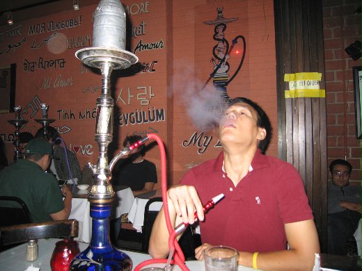 水煙抽起來味道不像雪茄那麼重,也不像香菸那麼嗆,雖不若大麻味美,但足以快慰疲憊旅人的心─尤其是剛從泰利颱風裡掙扎飛來的台灣旅人。雖然已戒菸多年,今天還是忍不住把煙吸進肺裡,讓水煙溫柔地包圍肺葉,整個人也醺醺然起來。