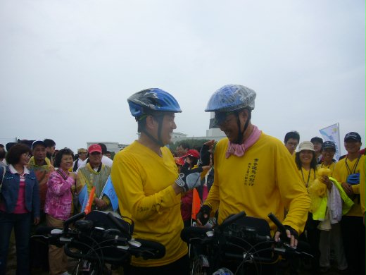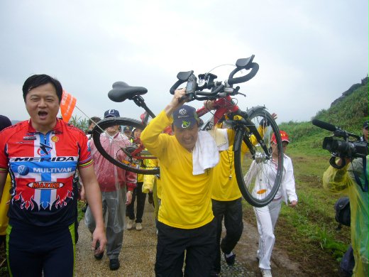 十分鐘後,馬英九從另一頭,扛著單車出現了,這是因為富貴角燈塔不准騎車,所以馬英九用扛的,一面也有「千斤重擔一肩扛起」的味道。