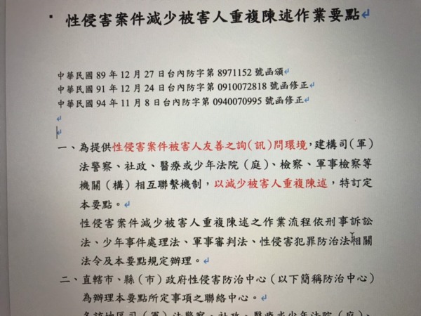 此時被害人的律師即可引用很重要的 《性侵害案件減少被害人重複陳述作業要點 》減少被害人在訴訟過程中受到的壓力與傷害!