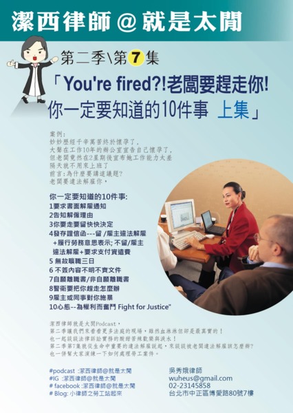 ”Podcast 潔西律師@就是太閒第二季第7集 「You're fired ?!老闆要趕走你! 你一定要知道的10件事 上集」
