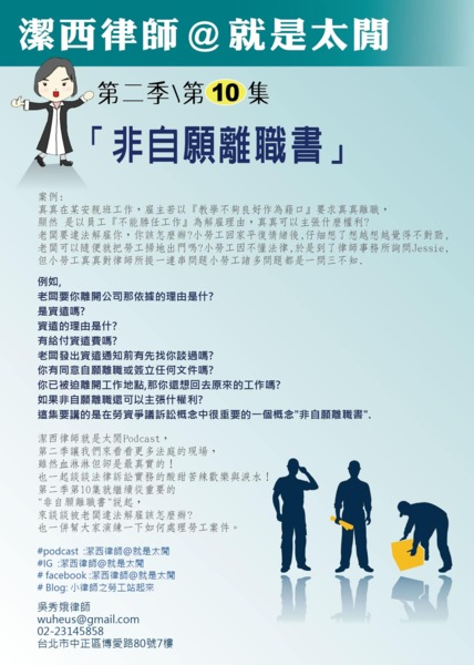 第二季第10集就繼續從重要的” 非自願離職書”說起,來談談被老闆違法解雇該怎麼辦?也一併幫大家演練一下如何處理勞工案件。