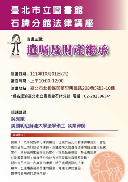 臺北市立圖書館石牌分館法律講座 演講主題:遺囑及財產繼承