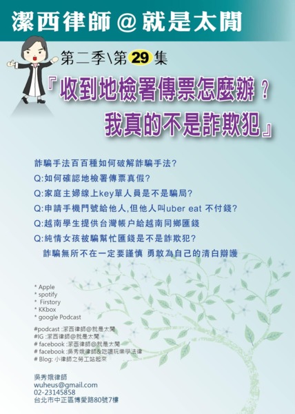 第二季第29集 Podcast 潔西律師@就是太閒 “收到地檢署傳票怎麼辦? ~我真的不是詐欺犯”