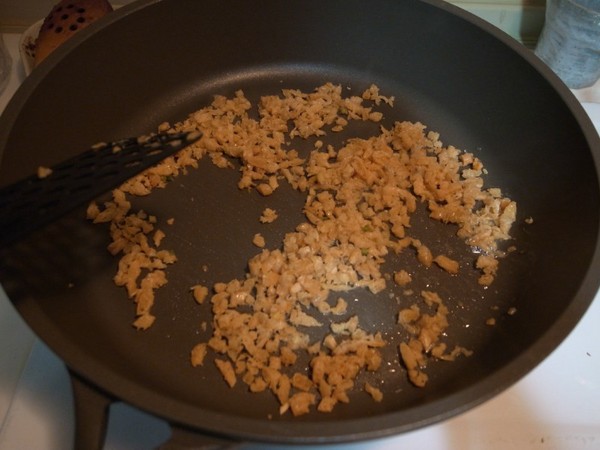 1.放油熱鍋,爆香薑末 | 2.放入蝦米末炒香 | 3.放入切小塊的青江菜梗 |