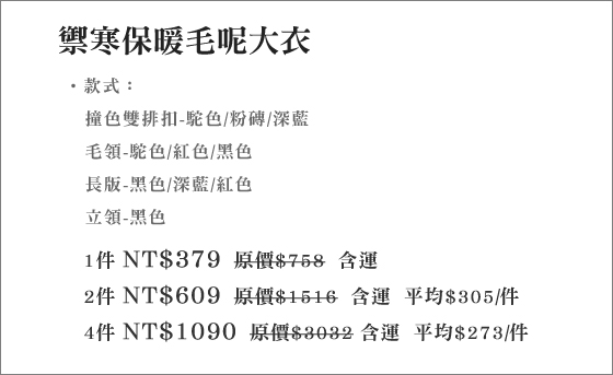 | 禦寒保暖毛呢大衣-用韓流外套抵擋寒冷,冬日也是俏麗妞一枚!撞色雙排扣、超Q毛領、成熟長版外套,一舉攻佔人們的心平均每件最低只要273元起(含運)即可購得禦寒保暖毛呢大衣1件/2件/4件,款式:撞色雙排 售價:273 我要購買 |