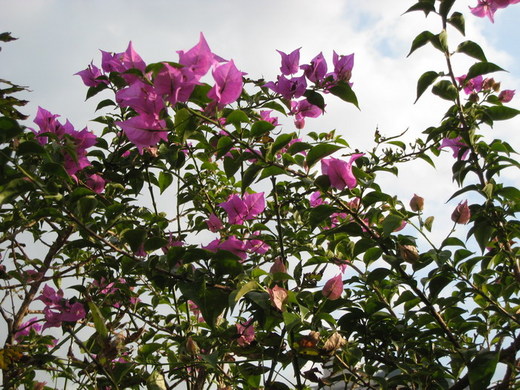 花園裡的九重葛攀滿已凋落葉子的青槭樹。望著這樣每年近冬都僅剩枝幹光禿的青槭,今年枝椏上竟意外綴滿紫紅色的花,初冬午后薄光襯出溫暖而花樣年華的幸福,我望著花樹而微笑。