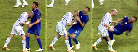 以前一直不了解2006世界杯足球大賽冠軍賽法國對義大利,法國隊長席丹那記頭槌要敲在馬特拉吉的胸口,導致紅牌出場,連帶讓法國輸掉冠軍。