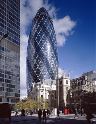 設計香港匯豐銀行的英國建築大師佛斯特(Norman Foster),為倫敦千禧年計畫設計的瑞士再保險總部大樓(Swiss Re Headquarters),以其子彈造型著名。特別是他利用螺旋結構,讓日光及氣流可在建築物裡流暢的運動,算是環保建築的代表作。