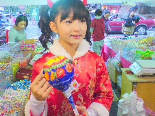 許雅涵說: 『每次過年都會跟把拔、媽媽一起來年貨大街買買!以前因為沒人認識我,可以和把拔、媽媽一邊走一邊試吃…吃一整條街的糖果,不用錢的喔!不過今年就不可以吃太多糖果,因為大家會說我壞壞!』說完,指著身旁的大小歌迷吐吐舌頭!