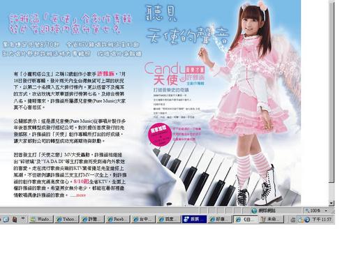 [自由時報明星館]有「小蘿莉塔公主」之稱12歲創作小歌手 許雅涵,7月16日發行新專輯,發片兩天內全台灣無貨可上架的狀況下,以第二十名擠入五大排行榜內。更以迅雷不及掩耳的方式,攻佔玫瑰大眾華語排行榜第七名,及綜合榜第八名。捷報傳來,許雅涵所屬漂兒音樂(Pure Music)大家莫不心喜若狂。