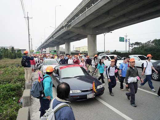 我想那天有跟著一起走的香燈腳大概會同意我的說法,那個行進的速度已經有點接近小跑步,兩條腿此時就像划槳般不經思索的往前走,瞄了一下GPS的速度,又再次逼近6KM/HR!這幾乎是正常人快速且持續步行速度的極限了吧?但只見大轎班的人員沒有停下腳步的跡象,仍然用很快、很快的速度持續往前。我的雙腳仍然還是楚痛著,但跟在神轎旁邊,似乎就有了一股心裡安慰的力量與不服輸的想法,雖然速度快,但卻也跟著撐了一大段路。突然之間,我記起了剛剛在休息時,一個也在路旁休息的香燈腳告訴我的一段故事:如果你走得很痛苦的時候,別忘了跟阿婆祈求一下,說你是某某人,今天跟阿婆出來進香,其實很想走這一段路,但是腿很痛,很難過,希望阿婆可以幫助醫治一下雙腳,讓這段路走得輕鬆一點。於是我就試著一邊走,一邊暗暗跟阿婆祈求著。早上往來上班的車輛很多,往南的西濱下方平面道路一群人簇擁著阿婆快速前行,偶而也會有祈求鑽轎底的信眾出現,此時速度會暫緩,也可以讓腿稍微歇息一下。