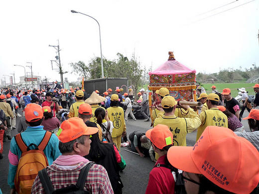 果不其然,聽著陣陣的鑼鼓聲與轟天的鞭炮聲越來越近,看來這下子也得打起精神繼續往前了。等到神轎一過我的面前,顧不得腳痛,馬上急起跟著步伐前行,這是我第一次跟在轎子旁邊步行,這才突然驚覺,原來阿婆的腳步是如此的迅速,也難怪稍早前和蝸牛兩個人在西濱快速道路上悠哉的走著,會一下子就被『海放&看不見車尾燈』…。