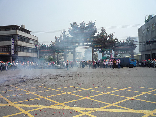 時序已經接近中午,似乎大家也預料到這個地點將會是如去年一般,是今天中午歇腳的地方。於是先抵達的車輛紛紛將車子停放在兩旁,而廟前超大的廣場上,朝天宮虎爺會台北分會的弟兄同時也上演著虎爺吃炮的表演活動。在轟然巨響、濃濃的煙硝炮屑轟炸後,這些熱血男兒仍然毫髮無傷地抬著虎爺,充分展現勇敢與自信,在整個力與美的表現下贏得觀眾滿滿的掌聲與喝采。此時蝸牛一邊拍片,一邊不可置信的說道:『真Man!這才是真的叫做放鞭炮嘛!』