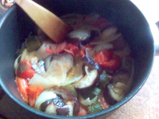 這道菜最簡單的方式就是懶人作法,把洋蔥大蒜爆香之後,剩下的菜切塊然後放進去,用小火慢慢的燜,但是這麼做就一點都不道地囉!我也沒嘗過用台灣茄子去做的味道如何,希望有人告訴我。