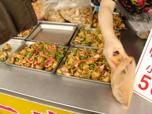 一小杯的沙茶魷魚切片,份量才是覺得不夠飽,又開始尋找下一攤了,不過這一攤是賣山東鴨頭的,比較特別的是宜蘭特有的三星蔥串大腸,不過我付錢就開始後悔了,一串蔥串大腸要價100元