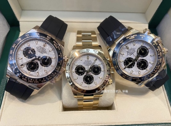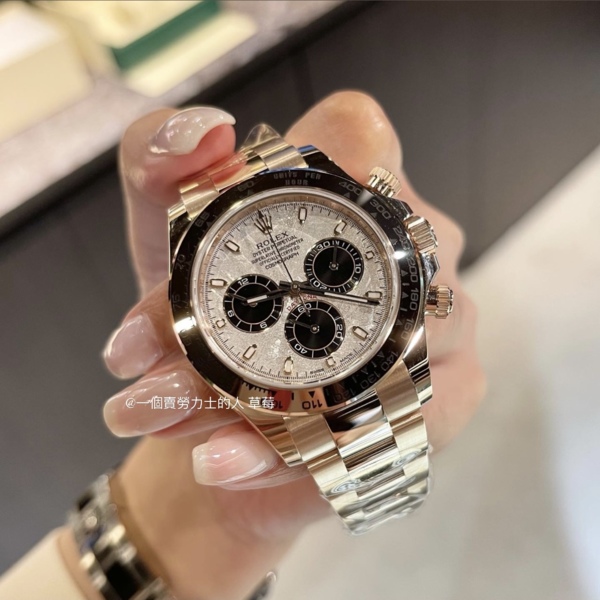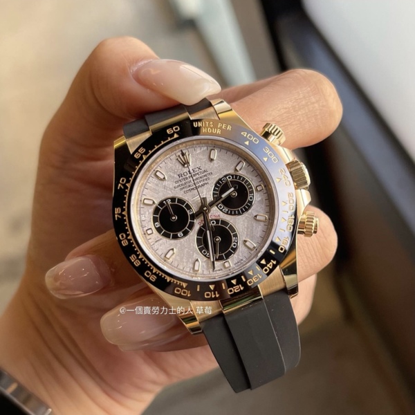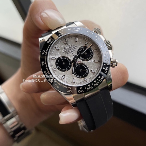 18k 白金搭配看起來更不起眼的黑色 Oysterflex 錶帶,白金隕石 Daytona 看起來最像一款休閒日常時計。白金錶殼的重量和隕石錶盤的美感。116519LN 也有黑色陶瓷表圈,比柔軟的金色表圈更耐磨。找尋此錶詢問玩錶人生草莓