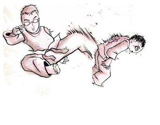 一邊說,一邊舉起腳踢向乙的屁股。