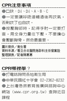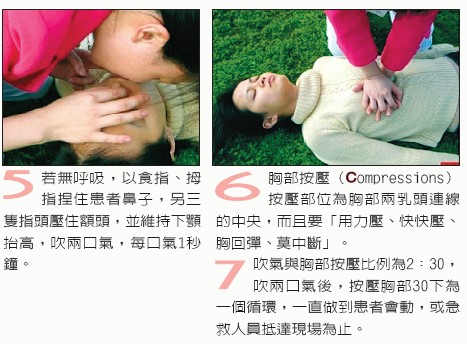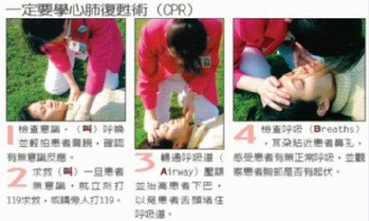 唯一救命的方法就是立刻叫119,做心臟按摩,而且現在已有證據顯示,就算不吹氣,只做心臟按摩,也有效果。