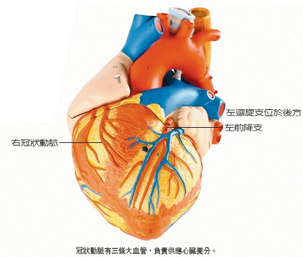 從構造上看來,新光醫院心臟內科主治醫師、內科加護病房主任洪惠風說:「心臟像穿了一件丁字褲。」由冠狀動脈負責供應心臟所需養分,冠狀動脈有三條大血管,分別稱右冠狀動脈、左迴旋支、左前降支,皆位在心臟的表面,外觀就像穿了丁字褲一樣,也因為宛如一頂桂冠般地分佈,而取其拉丁文字義,取名為冠狀動脈。