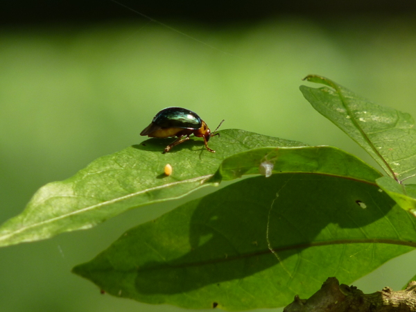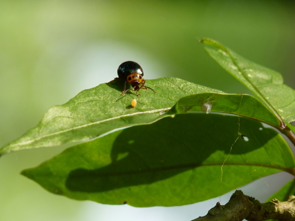 榕四星金花蟲是早春出現較多的昆蟲,也是常見的金花蟲,胸部橙黃具有四個排列的黑點,這是名字的由來,而樟科榕屬植物是牠們﹝幼蟲與成蟲﹞的食物來源。