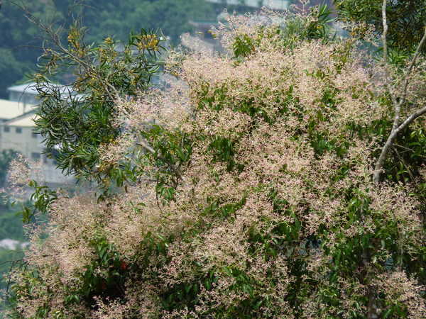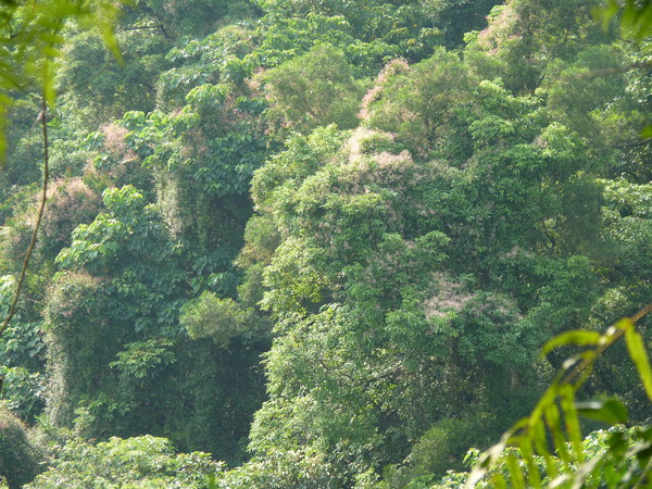 初夏的山林,常可見到一整片粉紅色的酸藤鋪蓋在樹木上,她們應該是很努力地爬上高高的樹木上吧?
