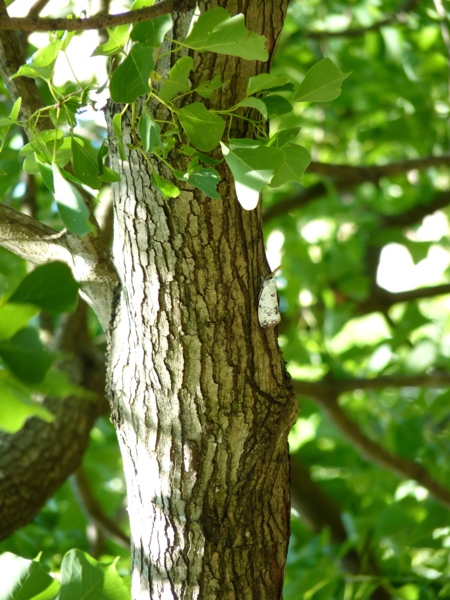 一樣的地點,一樣兩棵烏桕站在原地沒消失,但是我拼命地在樹幹上尋找,眼睛都快昏花了,但還是沒找著。看看周圍的環境,麻雀成群,白頭翁、五色鳥、樹鵲、斑鳩環伺,很難確保不被吞下肚。