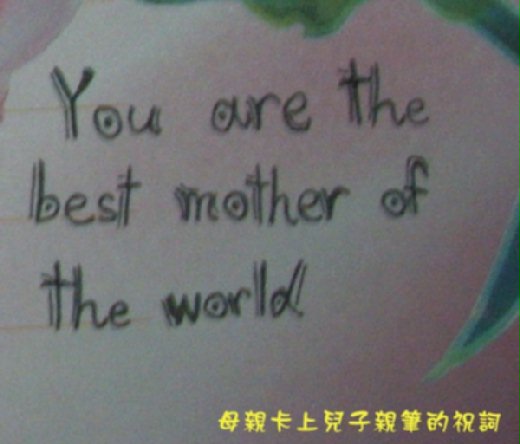謝謝您這十五年來辛苦的照顧我,也供我吃、供我睡,不管在何時,也都會在我需要之時幫助我,真的非常感謝您如此的付出。You are the best mother of the world!