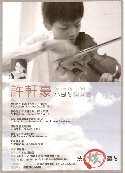 由於廣大熱愛音樂朋友們的支持,許軒豪同學這次(5/22)在新莊文化藝術中心的小提琴獨奏會,贈票索取已超過了八成(逾六百張),出乎主辦單位的預估,許同學本人倍受鼓勵,正勤奮加緊練習中,以期演出成功不負眾望。