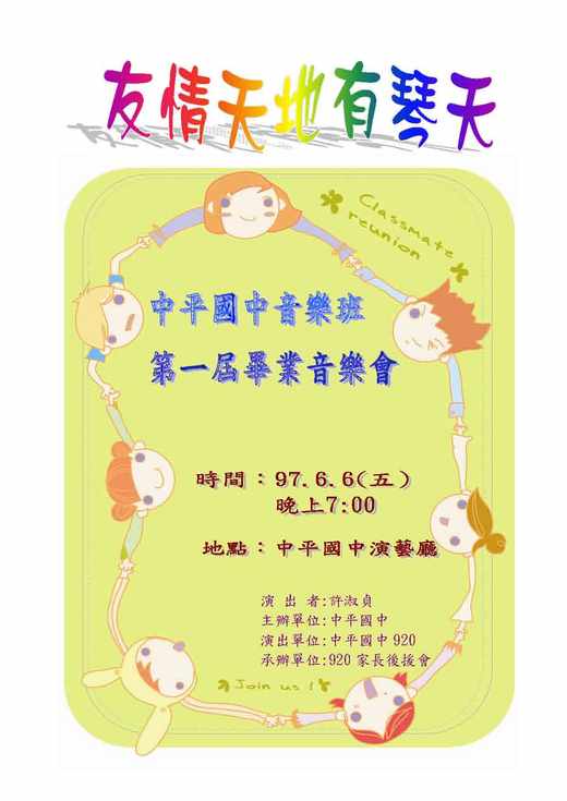 畢業在即,離情依依,只希望盡所能將6/6的班級音樂會辦的更臻完美,有緣有幸三年同窗,我在乎的是孩子們之間的情誼,以及留下這份美好的回憶,至於學校殘跛的制度、偏執的教育、腐敗的權威,將隨孩子們各奔前程之後被摒棄,教育是一生的計畫,中平國中不過是個階段而已。