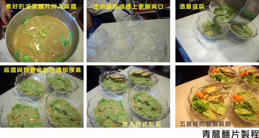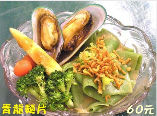 當剛煮熟熱騰騰的麵片佐以特製濃郁的麻醬時,散發出陣陣引人食指大動的香味,盛裝在透明的玻璃碗裡,視覺上的清爽更是誘發食慾。由於八里開發台北港之後河岸生態因而破壞,孔雀蛤不復過去產量個頭也變小,大頭老闆力求完美砸重資用進口貨,肉厚肥滿的孔雀蛤成了這道「青龍麵片」的點睛品。