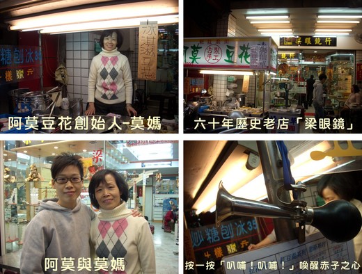 許久沒走踏新莊老街,這條小學時期時常步行去上學的路,當然已和過去大不相同,依稀之間還可尋回些許童年的記憶,「阿莫豆花」很好找,就在新莊三級古蹟「慈祐宮」旁第二個店家,目前是在自家騎樓經營,到達時才知阿莫家原來是新莊「梁眼鏡」,「梁眼鏡」可是新莊街上第一家眼鏡行,在尚未有「保倒」、「小淋」、「上胱」等等連鎖眼鏡公司之前,在地方上算是數一數二的配鏡專家,服務至今已有六十年歷史了。