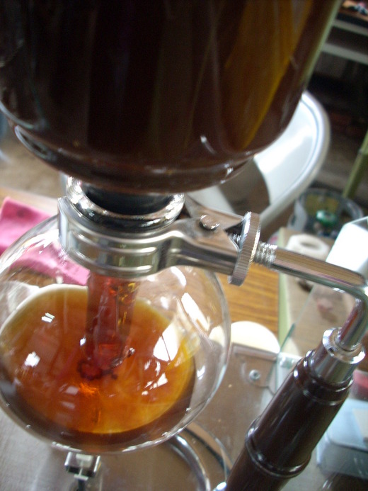 第二杯不必說,經老手研判過咖啡研磨的粗細度、火候觀察後的控制,再加上一名挑嘴歐巴桑的要求,才斟上小杯香醇四溢便冉冉飄散,啜飲入喉隨即苦而後甘,不酸不澀十分柔順,同樣的咖啡豆、工具,表現出來的咖啡勁道卻如此迥異,正所謂的「手路」。