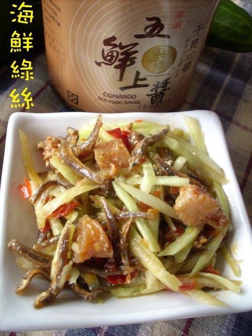 照片裡的XO醬是「東聖行」的商品,有小、中、大等三種辣度,我選的是小辣,當然,也可選用個人偏好的品牌,當XO醬的鹹味與辣味入了小黃瓜絲之後會被中和,再搭配了整顆干貝,簡單料理也能呈現高級口味。