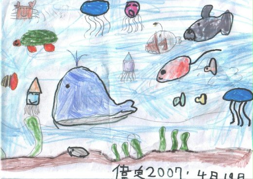 偉偉煞有其事的說:「阿姨!有一件事我好像沒完成。」「哪一件?」我問,「就是上次在阿公家畫的那張『海底世界』還沒塗好顏色!」「喔!我想起來了,現在要畫嗎?」我看了一下牆上的時鐘:「我們還有半個小時,慢慢畫吧!」找了一盒色鉛筆給他使用,於是他伏在茶几上認真的彩繪起來,我則坐在沙發上不發一語靜靜欣賞孩子的專注。