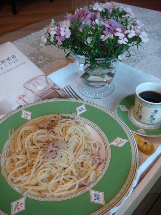用一個鍋子煮開水,放入些許的鹽,放入一人份的義大利麵條﹔用另一個平底鍋,將牛油放入鍋中,火不要太大,再將切細的洋蔥加入,炒到洋蔥變軟變透明後,將油漬鮪魚罐頭的油倒掉後加入一半的鮪魚,再加入中心點還有點硬的麵條,再加上一點煮麵的水伴一伴後,就是一道好吃的洋蔥鮪魚義大利麵了。搭配漂亮的盤子和咖啡杯,再加上一本書,這樣的早餐這樣的早上,我也滿足了。